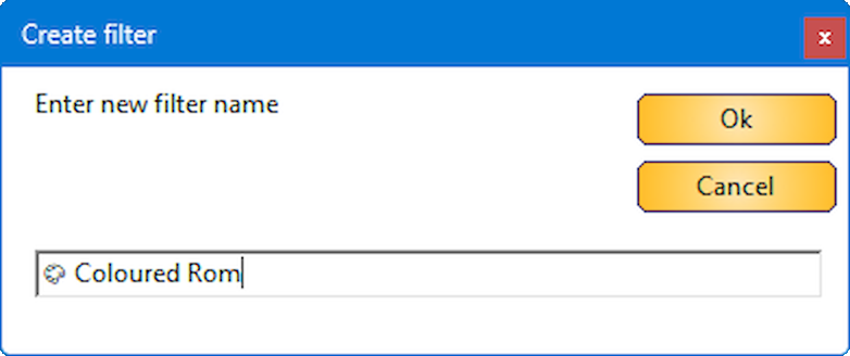 A dialog will appear asking you to name the filter. For example, if you want to mark tables with colored ROMs, you could add a Unicode symbol in the Display Name and call the filter '🎨Coloured Roms' Click OK to confirm. |
