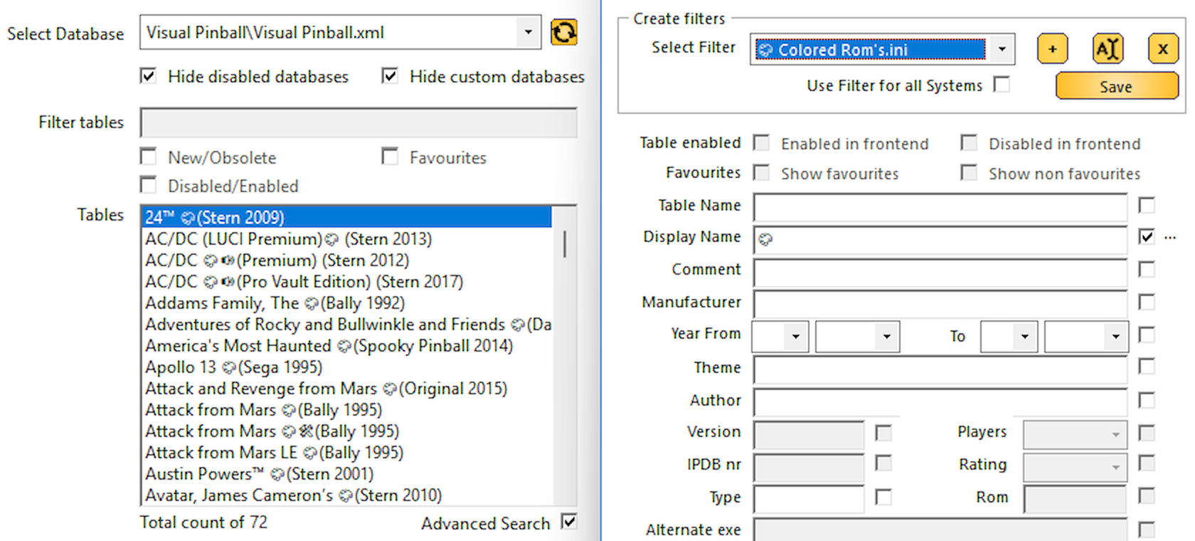 Custom filters allow you to define your own search criteria and make them available directly in the PinballX front end. This way you can quickly access specific groups of tables, such as themed collections or special ROM versions, without having to repeat complex searches every time.